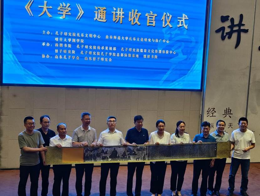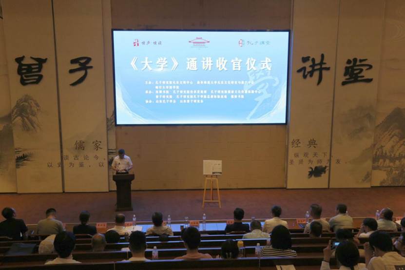 《大学》通讲第七讲结束后,举行了收官仪式,嘉祥县副县长闫法超高度评价了《大学》通讲系列活动,并作了总结。随后,孔子研究院党委委员、副院长袁汝旭,我院副院长宋立林共同合上了《大学》书册,收官仪式圆满结束。