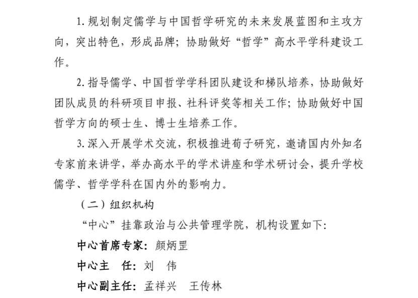 “儒学与中国哲学研究中心”由政治与公共管理学院与孔子文化研究院共建,挂靠政治与公共管理学院,由著名儒家学者、孔子文化研究院特聘教授颜炳罡先生担任中心首席专家,政治与公共管理学院刘伟教授担任中心主任,泰山学者青年专家、孔子文化研究院王传林教授、政治公共管理学院孟祥兴副教授分别担任中心副主任。