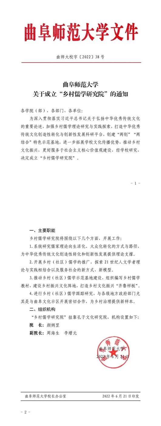 为深入贯彻落实习近平总书记关于弘扬中华优秀传统文化的重要论述,加强乡村儒学理论研究与实践探索,打造中华优秀传统文化创造性转化与创新性发展科研平台,创建“两创”“两结合”特色示范基地,进一步拓展学校文化传播优势,推动乡村文化振兴,更好服务于社会主义核心价值观建设,经学校研究决定,成立“乡村儒学研究院”。著名儒家学者、孔子文化研究院特聘教授颜炳罡先生担任院长,孔子文化研究院副院长周海生、政治与公共管理学院副院长李增元分别担任副院长。研究院挂靠孔子文化研究院。