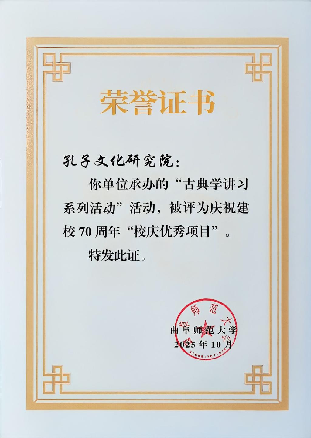 10月31日,曲阜师范大学举行庆祝建校70周年工作总结表彰大会,全面总结校庆工作成绩与经验,我院承办的“古典学讲习系列活动”荣获“曲阜师范大学70周年校庆工作优秀项目”。