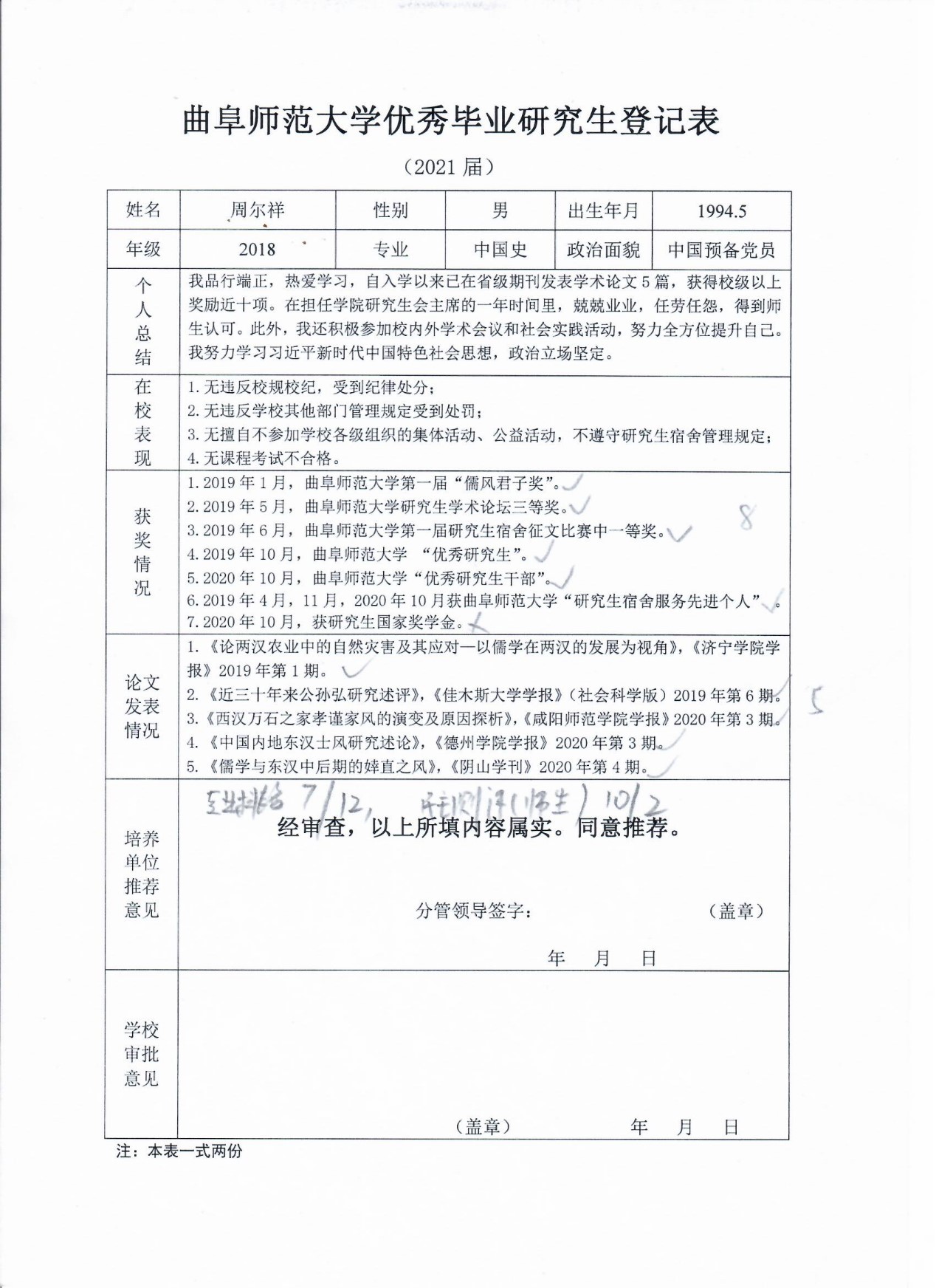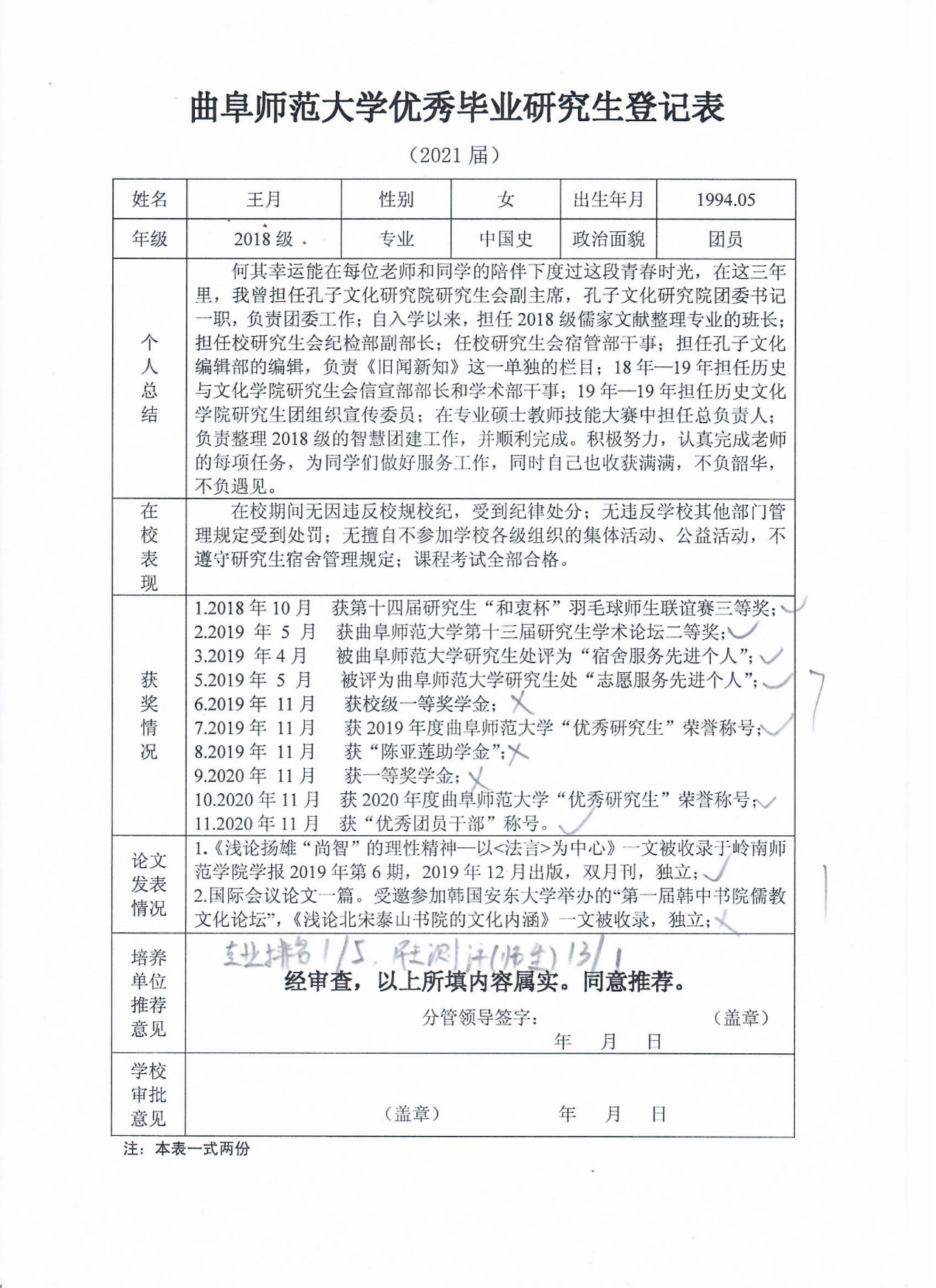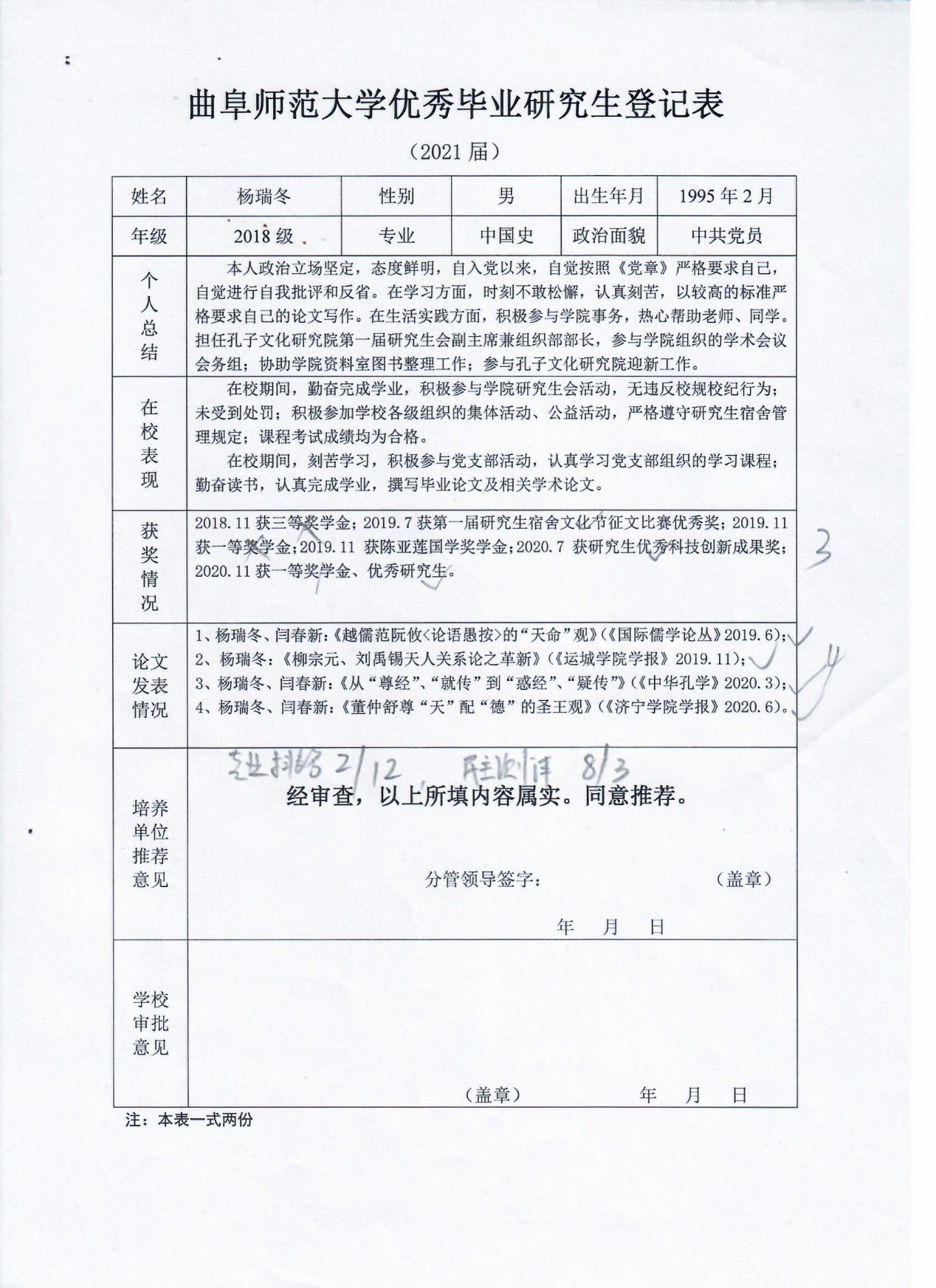 根据学校下发的《关于做好2021届优秀毕业生评选工作的通知》,经学生本人申请,综合考虑研究生的学习成绩、文章、获奖以及民主测评等情况,经孔子文化研究院优秀毕业研究生评审小组评选,拟确定孔子文化研究院2021届优秀毕业研究生名单如下: