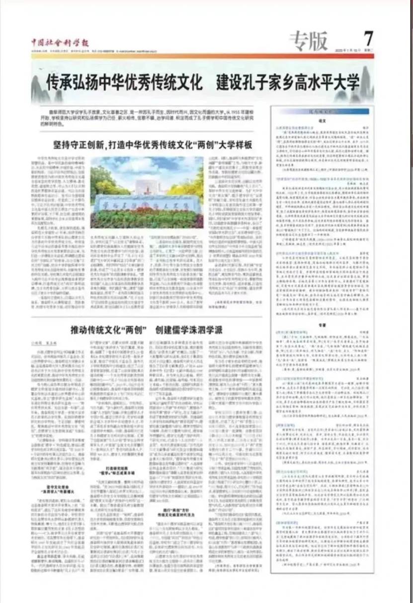 作为核心成员单位联合申报成立儒家文明省部共建协同创新中心,签署合作协议共建尼山世界儒学中心研究基地,设立“儒学研究基地”入选山东省社科理论重点研究基地……“胜日寻芳泗水滨,无边光景一时新”,近年来,曲阜师范大学进一步放大设学孔子故里的办学优势,弘扬深耕儒学研究的办学传统,守正创新、厚植特色,聚焦推动中华优秀传统文化“两创”,在儒家文化发源地筑起“为国弘文”的儒学高地。