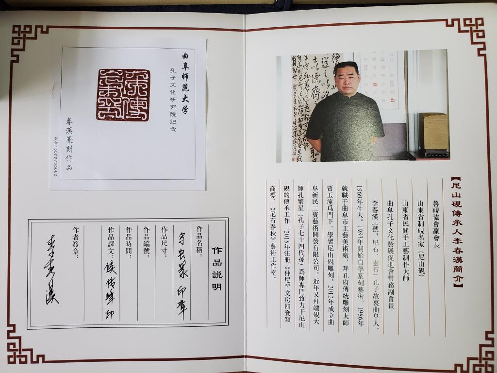 印章石料取材于孔子诞生地尼山,尼山石色泽鲜艳、松花叠翠、纹理明快,被砚界誉为“尼山圣石”。篆刻印章4厘米见方,15厘米高,厚重沉稳,富有手感,十三方印面都是李春汉教授根据每一位毕业生姓名和汉字具体特征而分别创意设计,有古玺的端庄灵秀、秦印的规整遒劲和汉印的阔拔雄健,也有玉箸篆的筋道雋永、现代印的写意抒怀,整体印风古朴典雅,金石共鸣,充满浓厚的人文气息,令人耳目一振。印章还配以印折、印座和作品说明,并用高档礼盒包装。