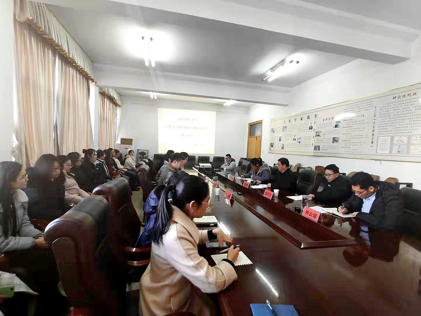 12月2日下午三时,曲阜师范大学孔子文化研究院第一届研究生会在国学院会议室举行成立大会。曲阜师范大学孔子文化研究院副院长翟文铖到会祝贺,邢学坤讲话,研究生辅导员李巧敏、研究生教学秘书钟云瑞以及第一届研究生会全体成员参加大会,生命科学学院研究生会副主席兼研究生团委副书记袁晓涵应邀参加成立大会,大会由第一届研究生会主席周尔祥主持。