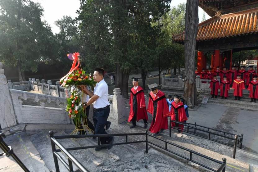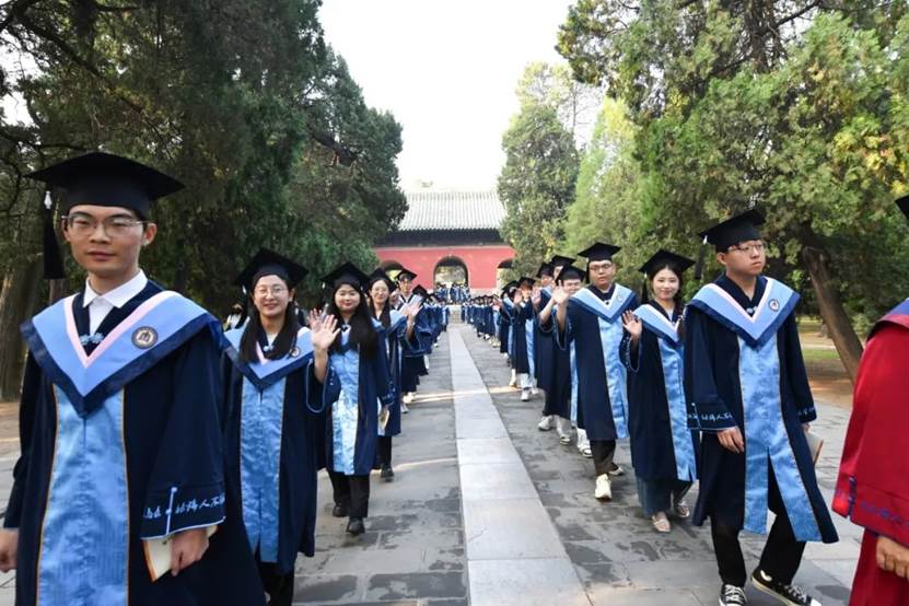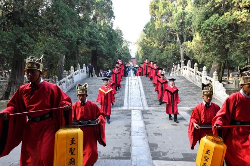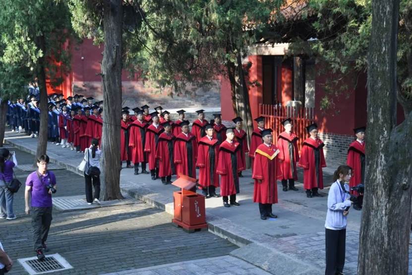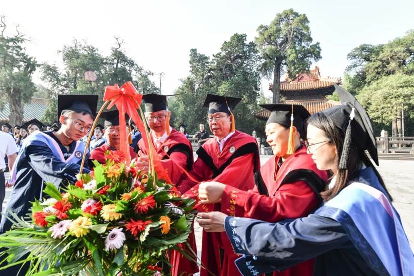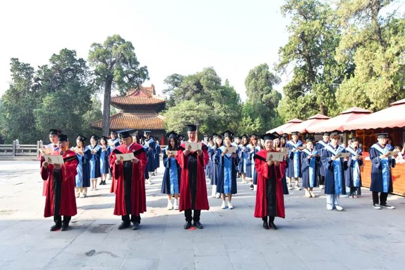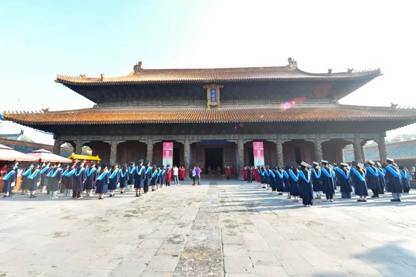 “礼义之始,在于正容体,齐颜色,顺辞令。”在孔庙杏坛中,导师团为毕业生正冠、拨穗。这一仪式结合了传统冠礼与当代毕业仪式,包含了对毕业生学业的肯定,以及对他们未来学术与人生道路的勉励、期许。
