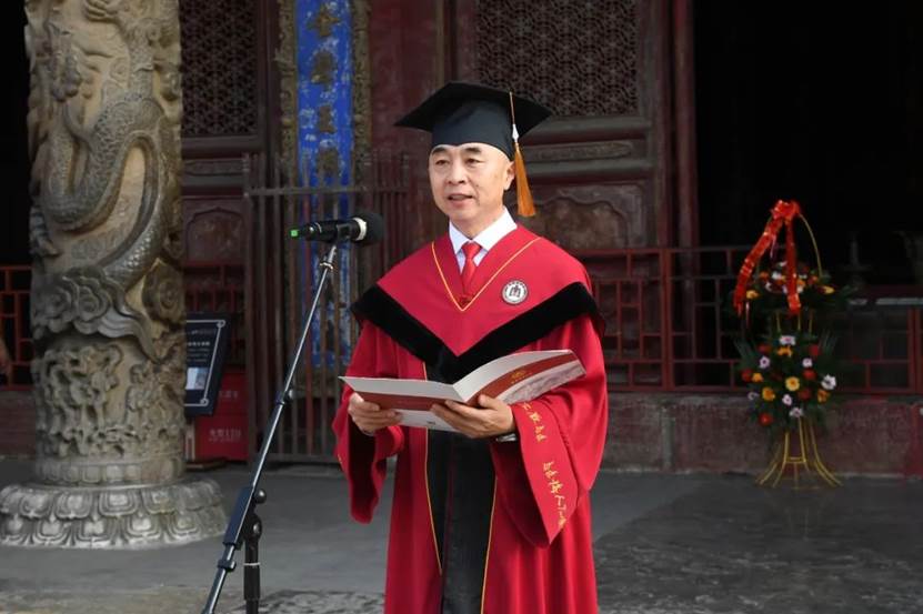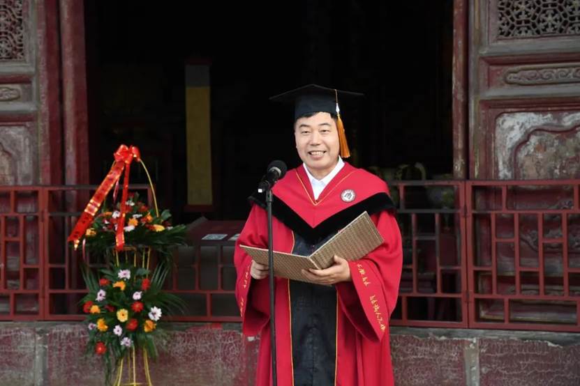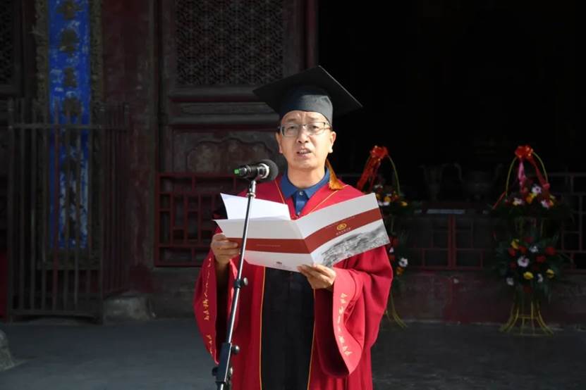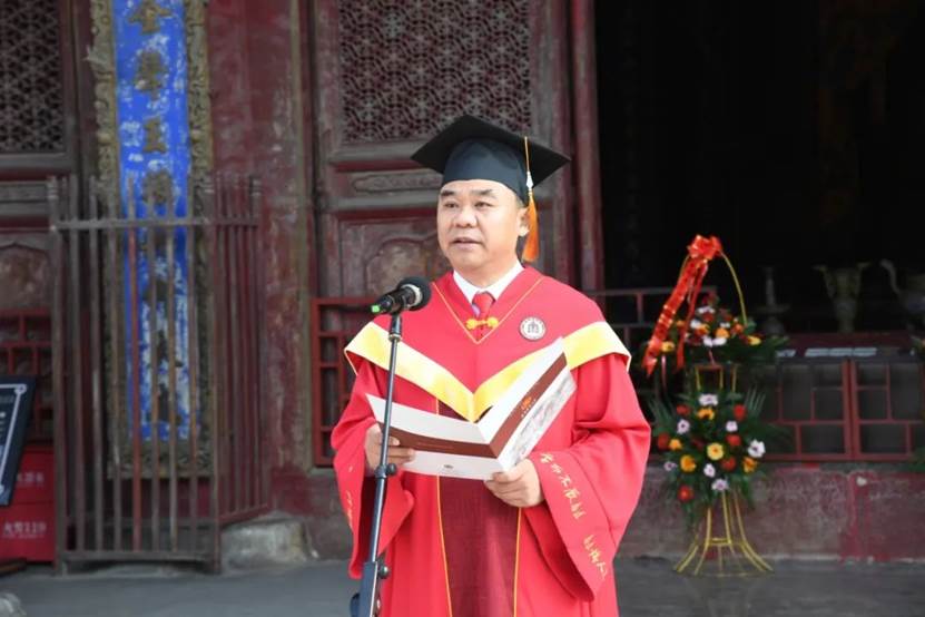 导师代表、历史文化学院博士生导师赵满海教授发表寄语。他寄语各位毕业生:“不宝金玉,而忠信以为宝”,继续保持学习的热情,让优秀成为一种习惯。他希望大家在努力践行自己价值、实现自己理想的同时,也要积极地回馈家庭、回馈母校、回馈社会,力所能及地帮帮那些弱势群体,始终保持一颗“恻隐之心”。他代表所有导师真诚地表示:孔子文化研究院、历史文化学院永远是大家的家,每位导师都是大家永远的挚友。