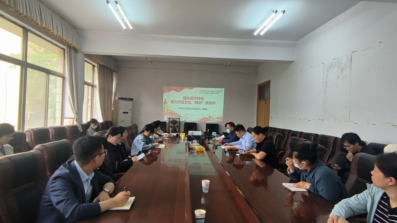 周海生同志对学习贯彻习近平新时代中国特色社会主义思想主题教育的总体要求进行了全面解读,指出“学思想、强党性、重实践、建新功”最终落脚点在于“建新功”,孔子文化研究院应充分发挥儒学研究特色,紧紧围绕总书记“两创”“两结合”重要思想和对优秀传统文化的重要指示,将学院打造成文化“两创”新标杆,为学校事业高质量发展建功立业。