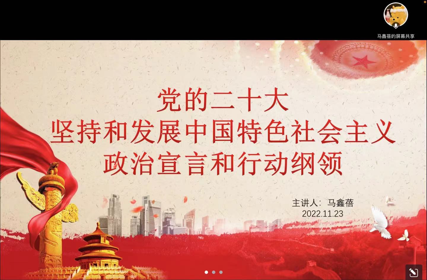 马鑫蓓以《党的二十大——坚持和发展中国特色社会主义政治宣言和行动纲领》为主题,从全面了解党的二十大的基本概况、深刻领会党的二十大的重大意义、充分掌握党的二十大精神的主旨思想、科学把握党的二十大精神的主要内容等方面进行了深入分析和系统讲解。她指出,这次大会明确宣示了我们党在新时代新征程上举什么旗、走什么路、以什么样的精神状态、朝着什么样的目标继续前进等重大问题,进一步指明了党和国家事业的前进方向,必将成为实现中华民族伟大复兴进程中的重要里程碑。