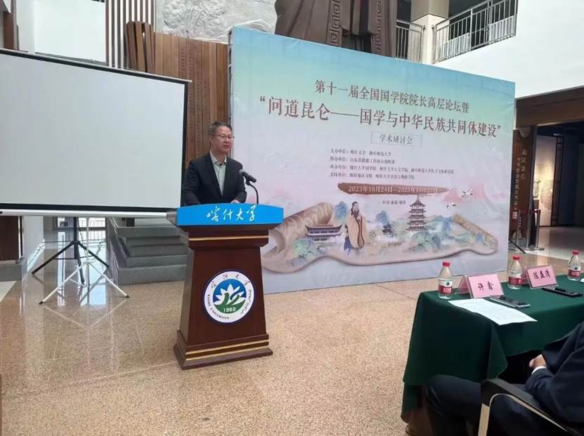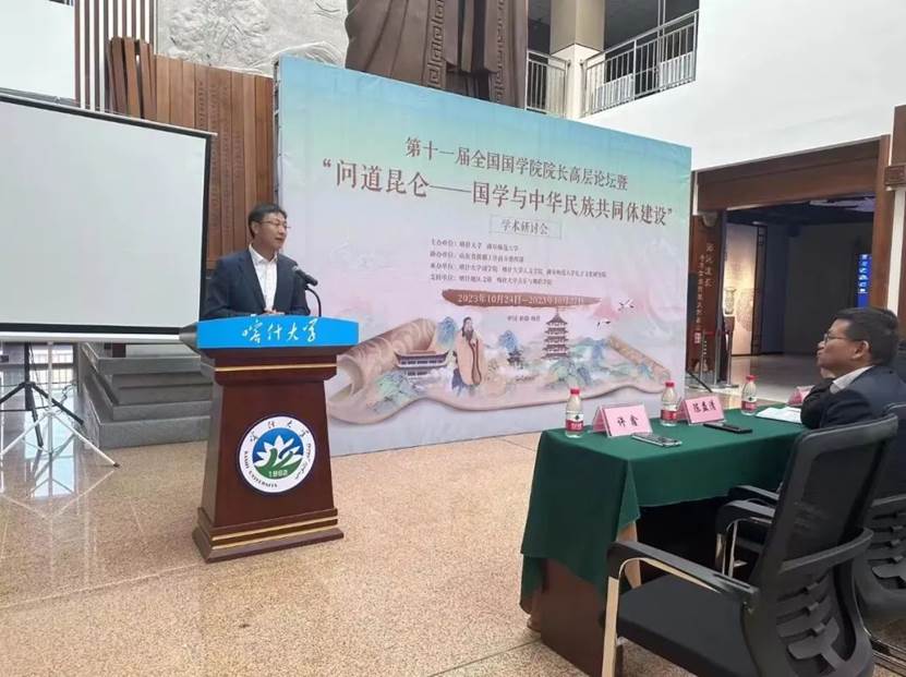 山东省对口支援新疆工作指挥部综合协调组副组长、文化润疆组副组长许鑫在致辞中表示,本次盛会,是铸牢中华民族共同体意识,实施文化润疆工程的重要举措,也标志着喀什大学国学院的发展借势启航,再上台阶,再启新程,再发新力。今天藉着文化的东风,在西部边疆举办本次国学研讨会,是新疆首次,也是国学院院长论坛举办以来的第一次进边疆,衷心希望能够以此为契机,进一步探求国学文化服务于时代的现实路径,“为天地立心,为生民立命,为往圣继绝学,为万世开太平”努力打造南疆中华优秀传统文化教育基地,共筑中华民族共有的精神家园。