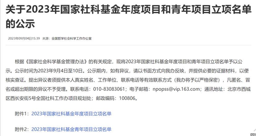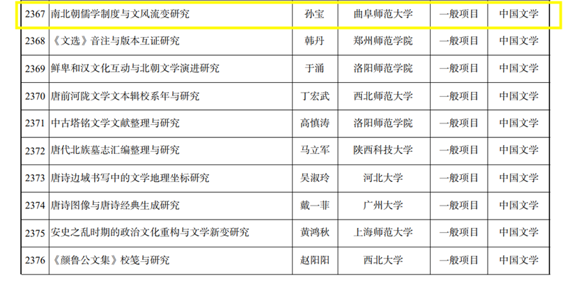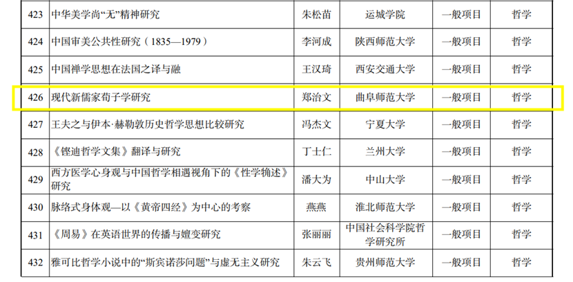 近日,全国哲学社会科学工作办公室下发了《关于2023年国家社科基金年度项目和青年项目立项名单的公示》,我院2023年度国家社科基金项目申报成果喜人。共有2个项目入选国家社科基金立项公示名单,分别是孙宝老师的“南北朝儒学制度与文风流变研究”和郑治文老师的“现代新儒家荀子学研究”。