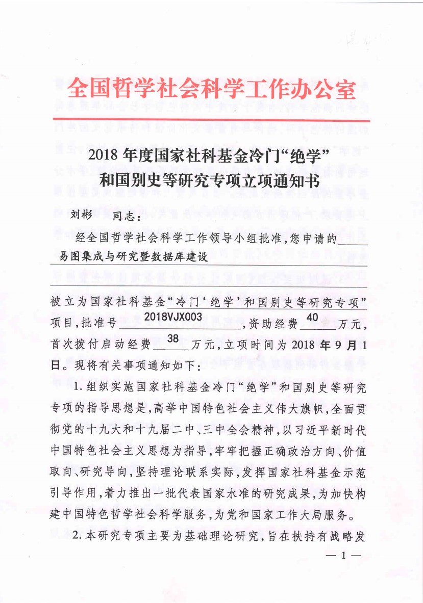 “易图集成与研究暨数据库建设”课题,于2018年获得国家社科基金冷门“绝学”与国别史研究专项立项,由刘彬教授主持。易学研究历来有义理易学和象数易学两大领域,而自宋代以来一千多年的易图易学却长期被忽视。本课题致力于全面搜集东亚易图文献,将所有易图汇编集成,建立数据库,并界定易图学概念,划分易图类别,勾勒发展脉络,复原易图学派。本课题现已经取得阶段性成果,出版海内外首部大型“易图学丛书”《易图文献选辑》三辑175册,出版《张理易图学著作两种》《皇极经世图释》等著作,发表有关论文十多篇,培养易图学研究人才二十余人。结题成果《易图集成》约三十册,即将完成。