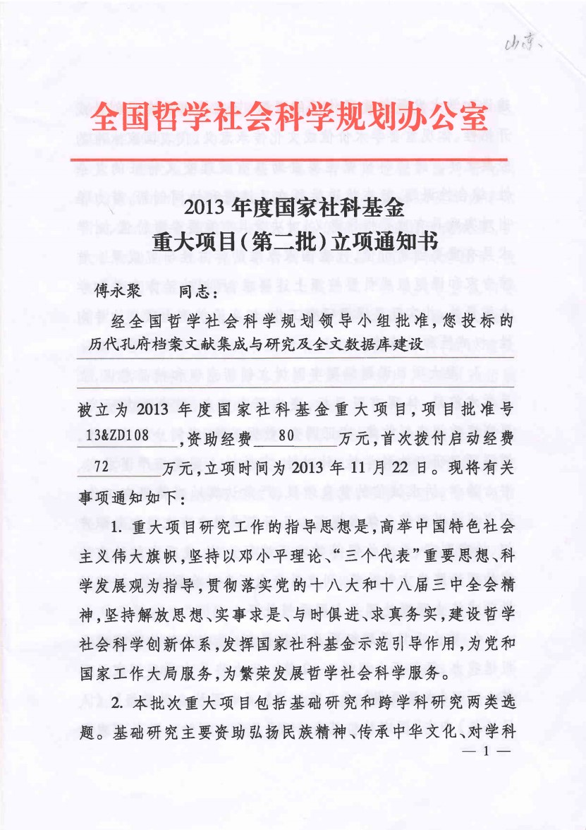 2013年获准立项。该项目由中心协同单位曲阜师范大学与曲阜市文管会合作承担。项目旨在充分利用曲阜宝贵的历史文化遗产,有效整合现有资源,集中优势力量,对孔府档案进行抢救性整理和挖掘研究,并开展数据库建设。项目的实施对于保护和利用馆藏珍贵文献档案,弘扬中国优秀传统文化,提升曲阜知名度和文化影响力具有重要意义,必将为推动曲阜文化经济特区建设做出积极贡献。孔府档案是保存于曲阜衍圣公府第的私家档案。现存档案始于明嘉靖十三(公元1534)年,止于1948年曲阜解放,约25万余件。文体繁多,包括题本、咨文、移文、札付、申告、喻示、禀文、牌传,文书、保结、委札,谱牒、家规、摘抄、语录和碑文等;内容浩瀚,涉及朝廷、政治、宗族、袭封、祀田、祭祀、家谱、林庙、属员、诉讼、租税、赋役及庶务等。孔府档案作为儒学体系的重要组成部分,是中国社会史和明清至近现代史研究的瑰宝。