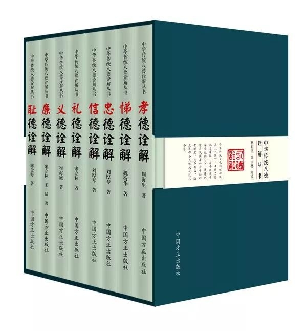 《中华传统八德诠解丛书》由中国方正出版社2017年出版,是中央纪委宣传部重点项目,由杨朝明、宋立林担任主编,历时3年倾力打造而成,我院刘厚琴、宋立林、周海生等学者承担了八册中的五册,以党员干部为重点读者对象并兼顾社会大众。该丛书分别阐释了“孝悌忠信礼义廉耻”的历史起源、发展脉络和本质内涵,对当前社会存在的道德现象特别是党员干部的思想道德问题进行了深入剖析,阐发了中华传统八德新的时代内涵和价值意义,是国内首部以丛书形式诠释中华传统八德的通俗理论读物,是我校传统文化两创的重要成果。2017年2月28日,《中华传统八德诠解丛书》新书发布会在北京举行,《人民日报》《光明日报》《中国纪检监察报》《中国青年报》及腾讯网等国内三十余家媒体参加了发布会,著名学者、中国社会科学院研究员李存山、北京大学教授干春松等对丛书予以高度评价,认为这部丛书是图书出版界的“补白之作”。本套丛书出版后央视《新闻联播》《正午时分》等予以报道,并荣获第33届山东省社科优秀成果二等奖,第五届山东省社会科学普及与应用优秀作品奖、国家新闻出版广电总局第二届向全国推荐的中华优秀传统文化普及图书(50种之一)。