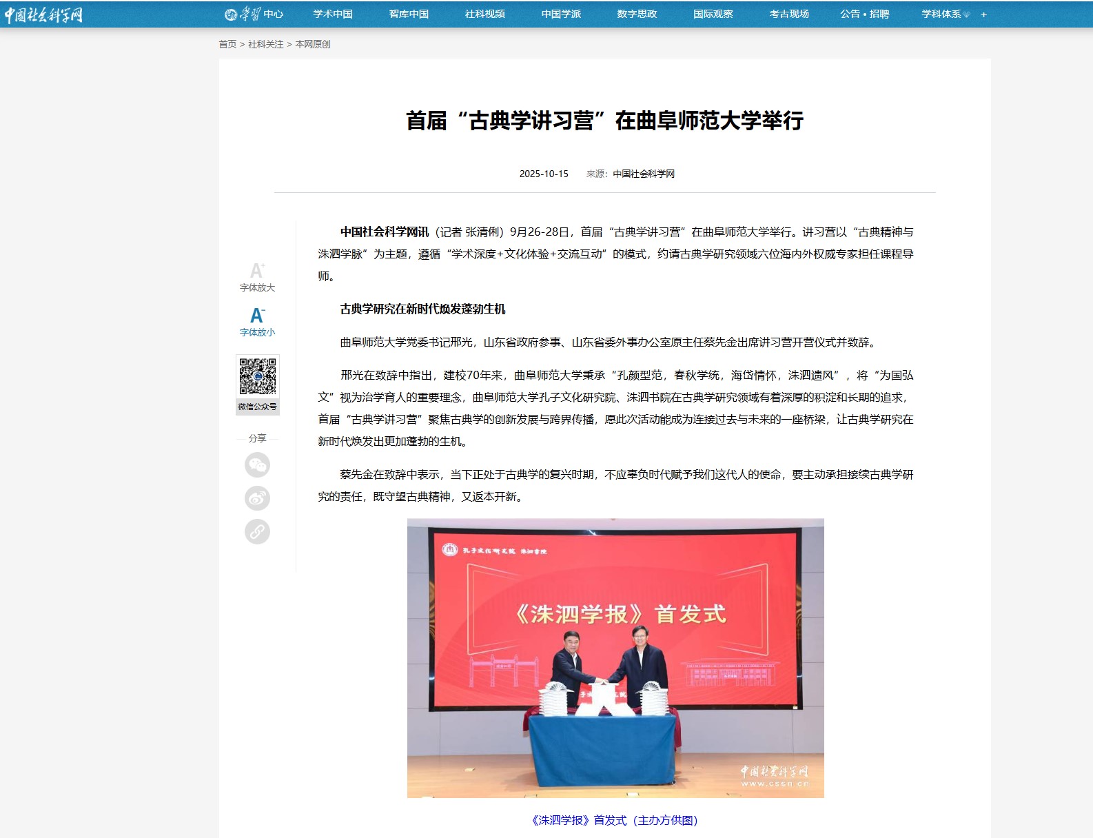 2025年10月15日,“中国社会科学网”以“首届‘古典学讲习营’在曲阜师范大学举行”为题,报道山东省文化与旅游厅与曲阜师范大学主办,孔子文化研究院、洙泗书院等单位承办的首届“古典学讲习营”。